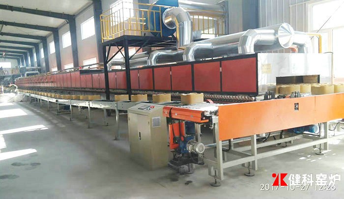 輥道窯的燃燒室在輥子的下方,用壓縮空氣霧化重油、柴油、煤油等燃料進行燃燒。也有用煤氣發生爐所產煤氣進行燃燒的,比較大型的陶瓷廠大都采用雙段冷煤氣站,使用冷靜煤氣進行燃燒,產生高溫。燃燒室與輥道之間,有耐火材料隔離,火焰不直接接觸被燒制的產品。相對來說,煤氣發生爐配套輥道窯燃燒比重油、柴油等成本低,比直接燃煤效率高環保達標。使用重油為燃料時,為防止煙氣污染制品,要采取隔焰或半隔焰形式。電熱時,為保護發熱體或使溫度更均勻,也需將發熱體和制品隔開。